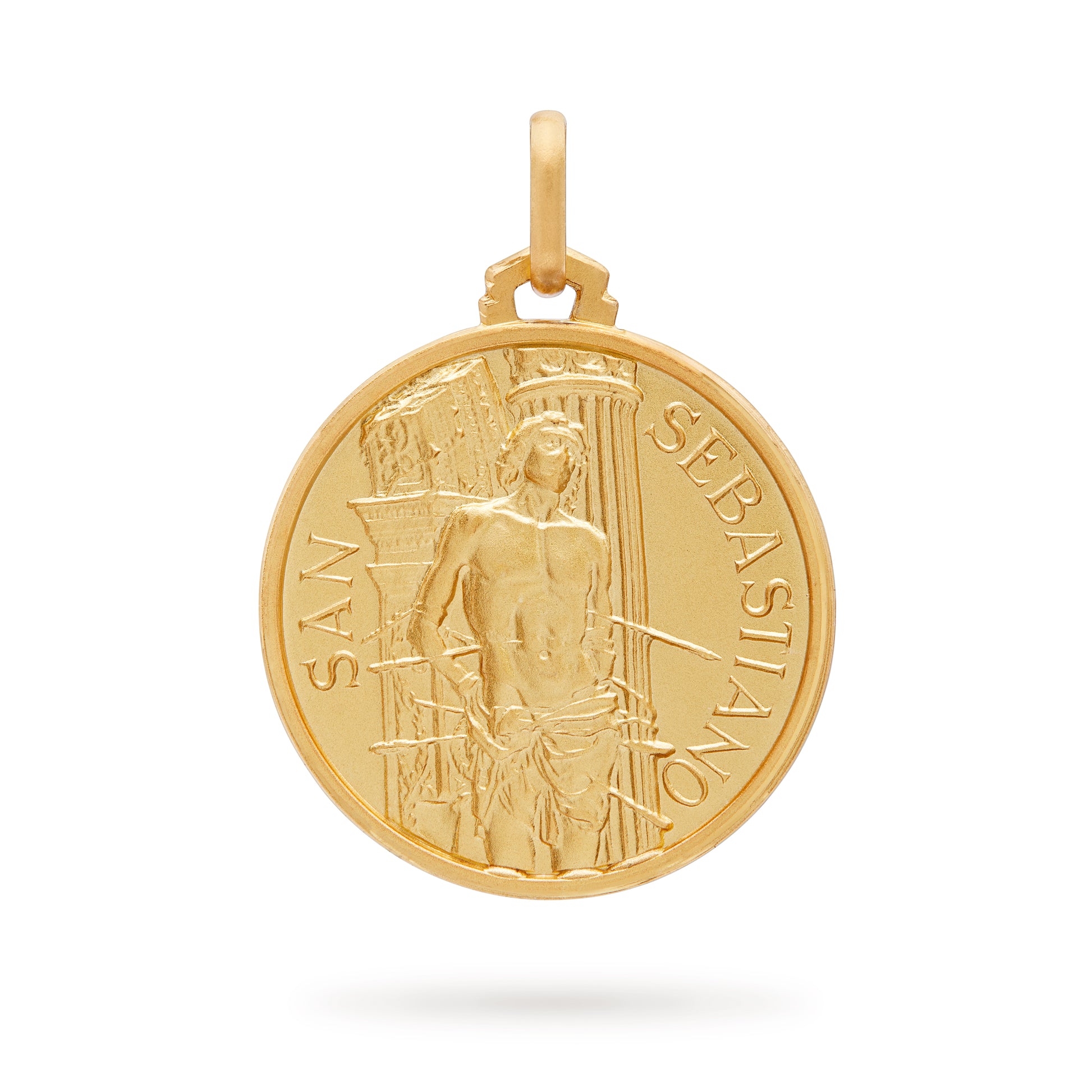 Medaglia di San Sebastiano in oro giallo 18 kt. Sebastiano, cristiano di nascita era una guardia a servizio dell'imperatore romano Diocleziano. Grazie alla sua posizione, aiutava e portava conforto ai cristiani destinati alla morte. Quando l'imperatore lo scoprì, condannò Sebastiano al supplizio delle frecce dal quale uscì miracolosamente quasi illeso. Fu successivamente torturato e ucciso. Oggi le sue spoglie si trovano all'interno della basilica di San Sebastiano fuori le mura, a Roma.