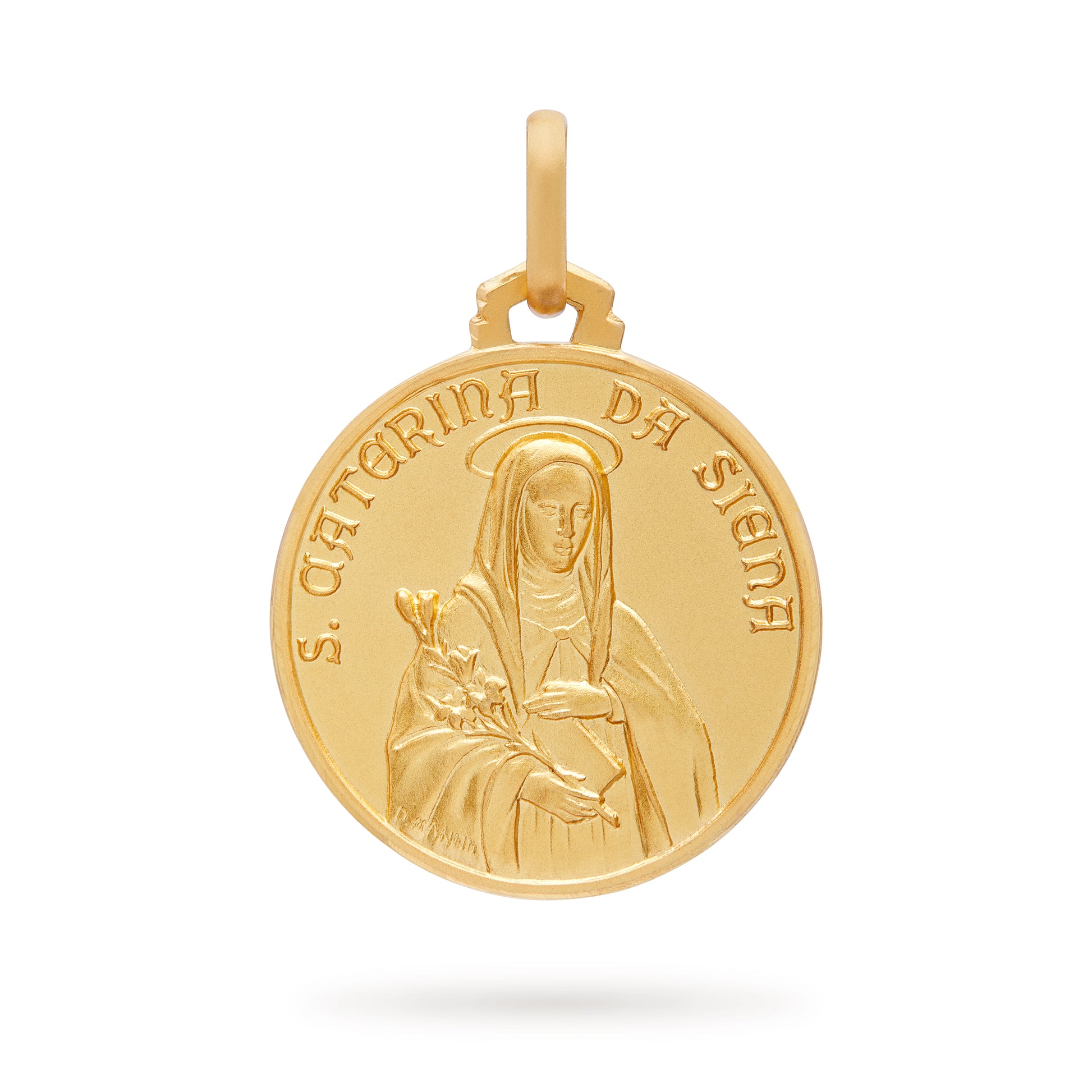 Medaglia di Santa Caterina da Siena in oro giallo18kt. Vergine e dottore della Chiesa, che, preso l’abito delle Suore della Penitenza di San Domenico, lottò con forza e senza sosta per la pace, per il ritorno del Romano Pontefice a Roma e per l’unità della Chiesa, lasciando pure celebri scritti della sua dottrina spirituale. E' la santa patrona d'Italia.