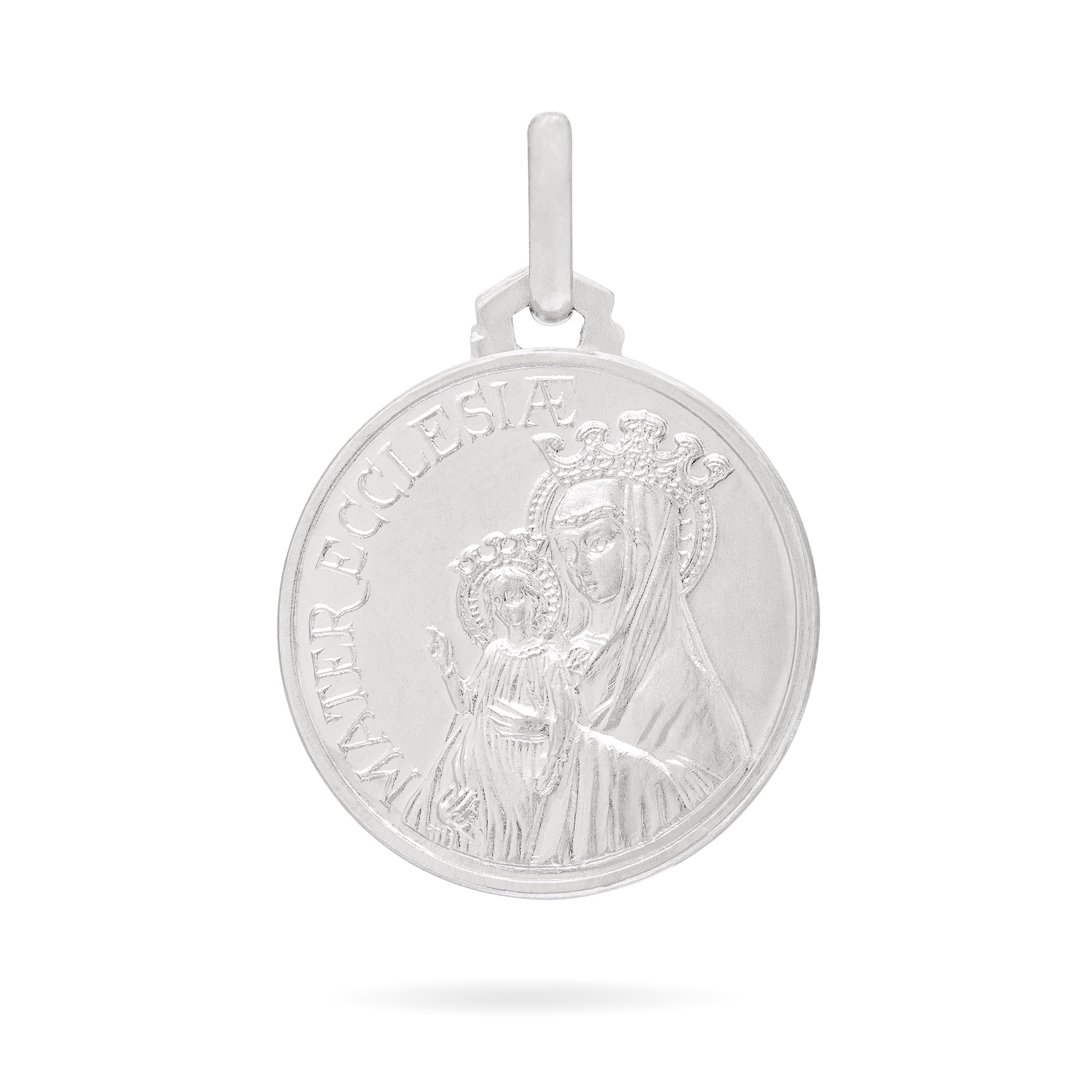 Medaglia in oro bianco 18kt della Mater Ecclesiae. Meravigliosa riproduzione in ciondolo del mosaico della Beata Vergine Maria presente in Piazza San Pietro. Venerata dal popolo romano e in particolar modo da Papa San Giovanni Paolo II, la Mater Ecclesiae, in italiano Madre della Chiesa, rappresenta il ruolo Materno di Maria nella Chiesa e per la Chiesa. Maria è colei alla quale tutti i fedeli dovrebbero affidarsi.
